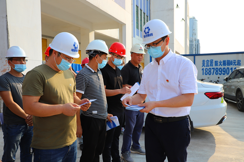 綠港集團(tuán)黨委書記、董事長(zhǎng)龔國(guó)強(qiáng)給項(xiàng)目一線人員發(fā)放《工程建設(shè)廉政手冊(cè)》(張彩秀 攝)